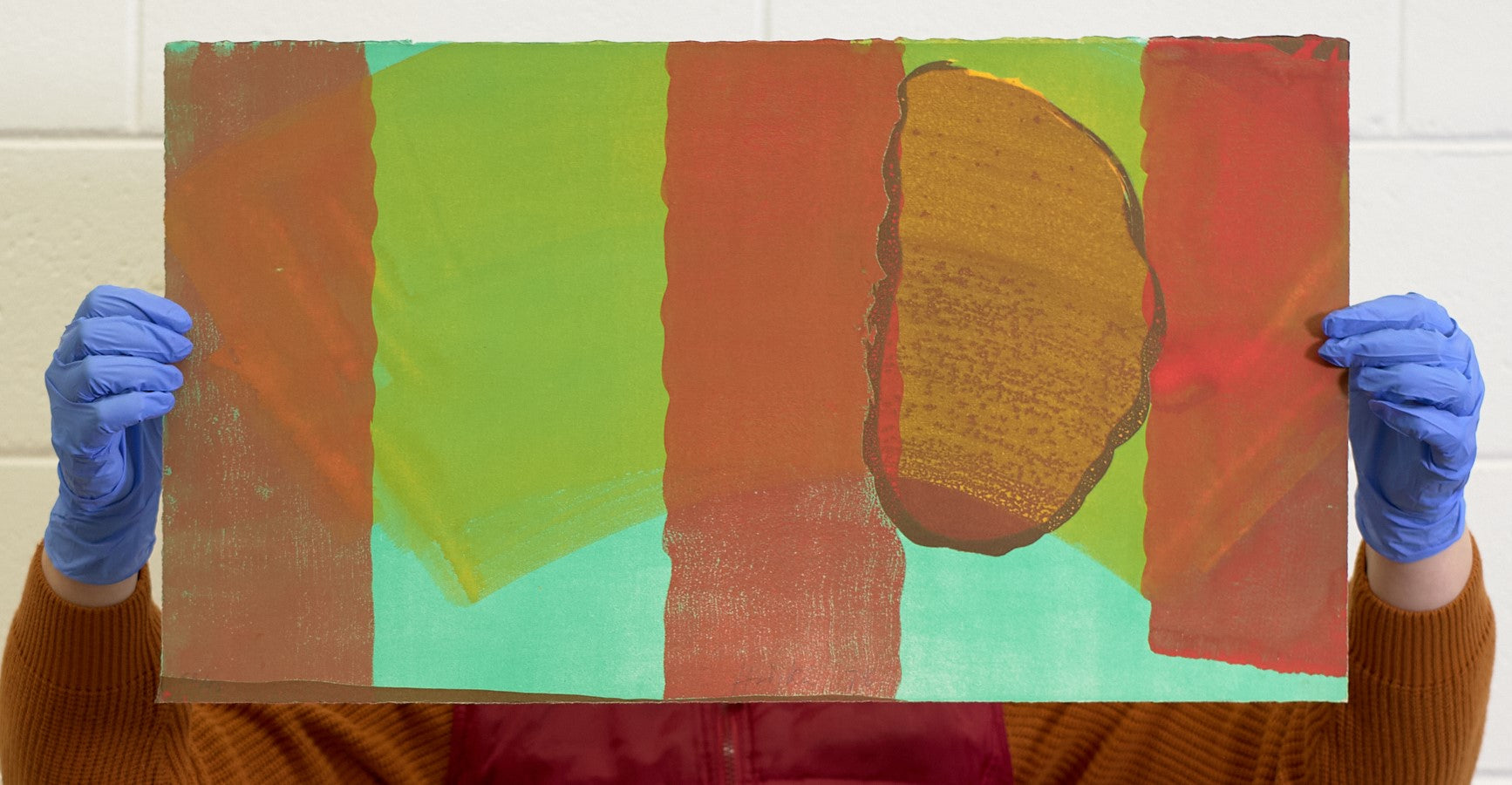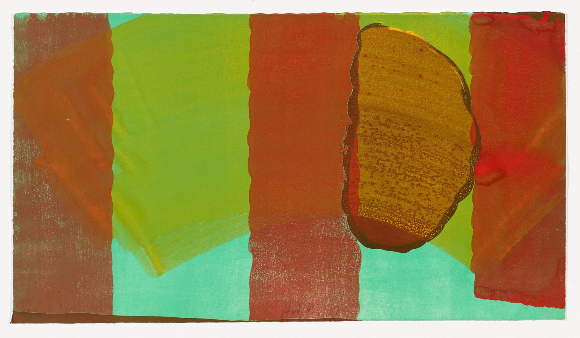 Lithograph, printed in emerald green, red-brown, and grey, from three zinc plates; with hand-colouring in yellow watercolour and red gouache.