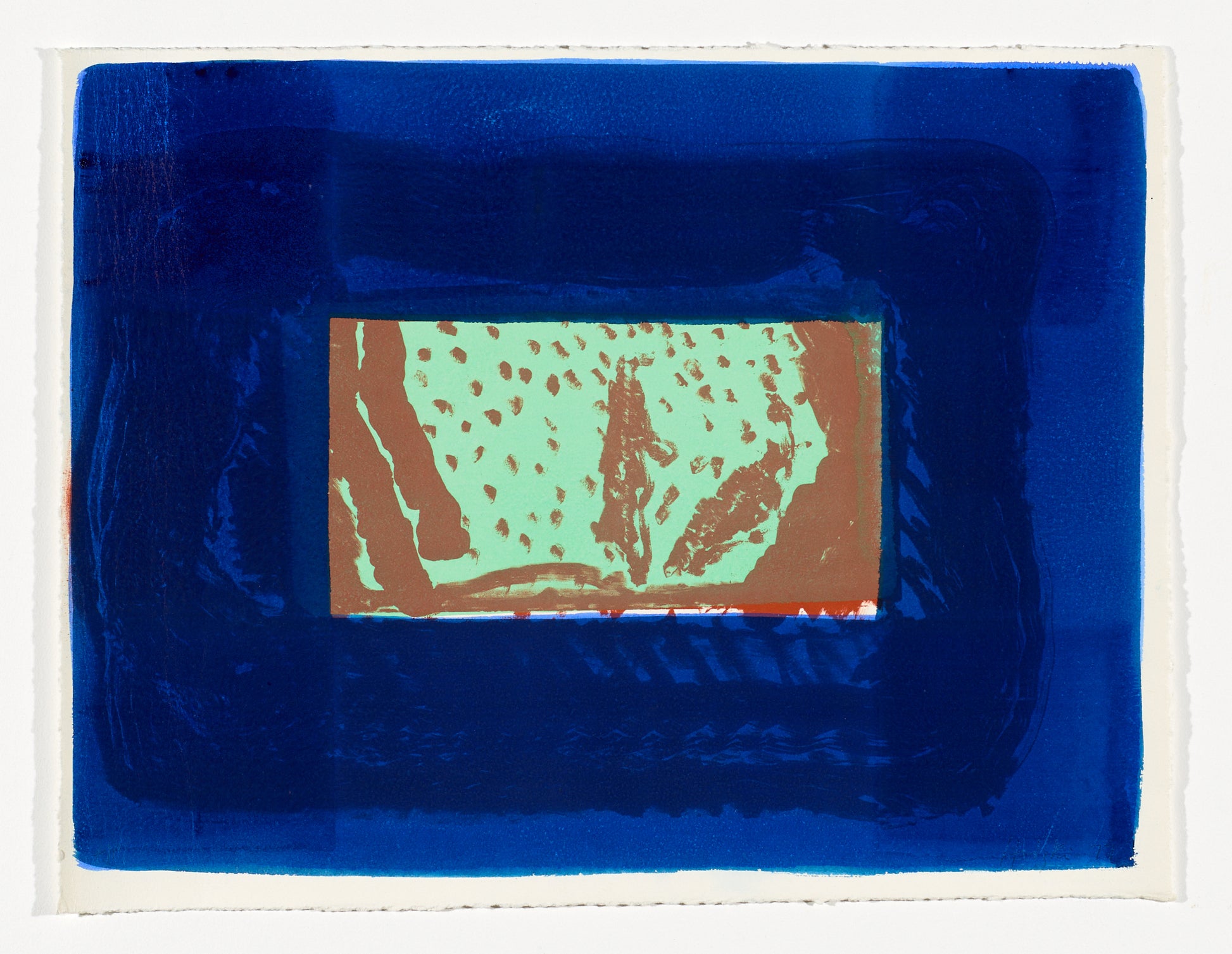 Lithograph, printed in sepia and green, from two stones; with hand colouring in two shades of blue gouache.