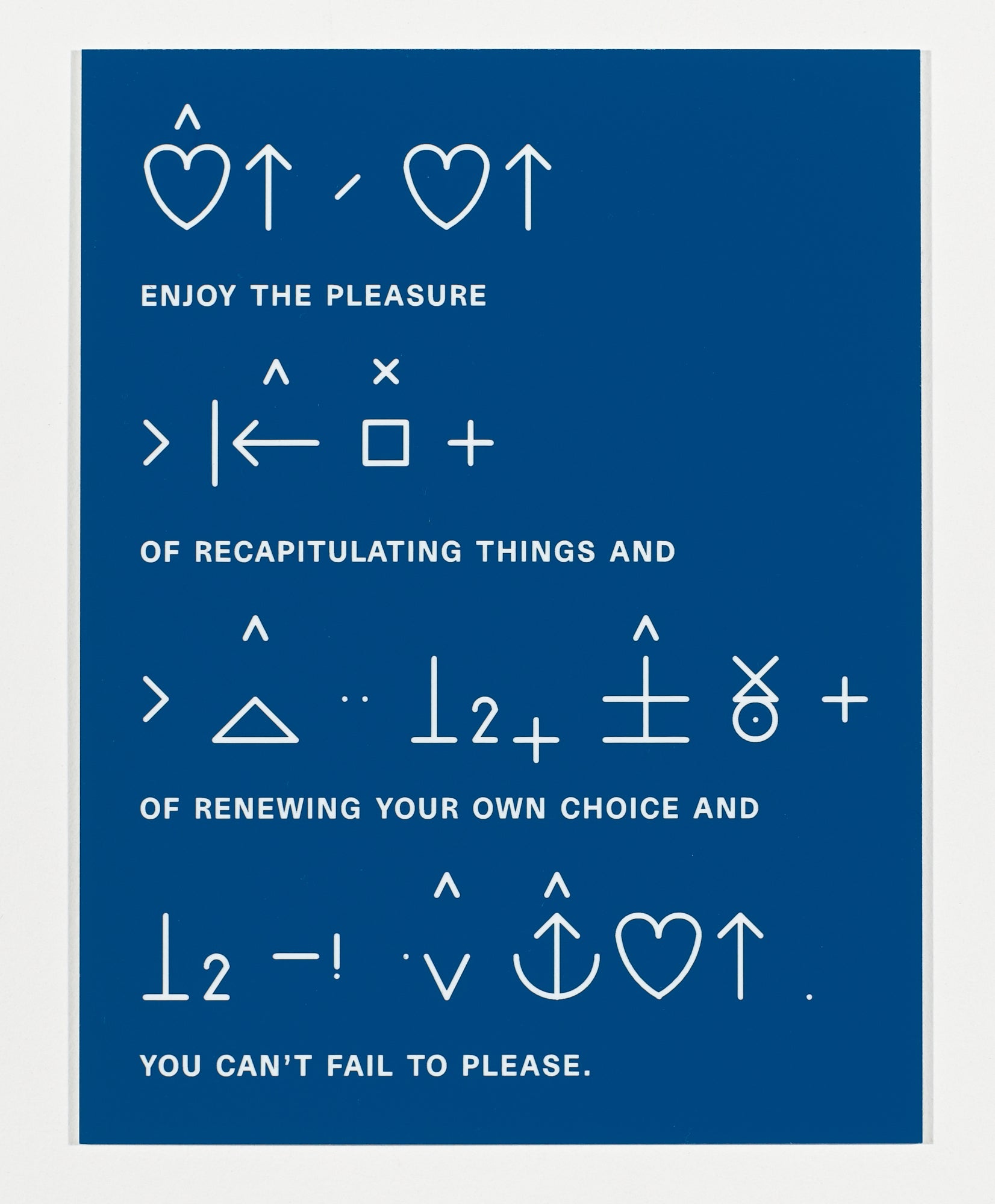 Although Bliss was considered by its maker to be a revolutionary invention, one of the apparent, humble uses for Bliss was its trans-lingual application for signage. McNaught honours this by inscribing his translations on engraved traffolyte (a plastic material commonly used for signage). His words, however, a cribbed from various sources, are not straightforward directives. McNaught advises that, to become fluent in Bliss, “you can only fall in love with it, the way you fall in love with a person: nonfluently, partially, with some degree of creative misunderstanding.”