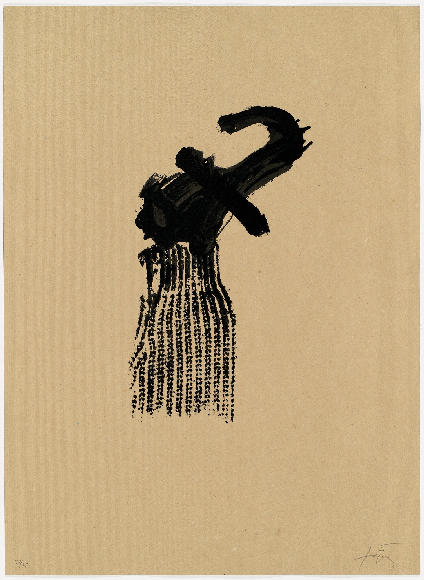 This variant of Llambrec 10 is printed "sobre paper d'estrassa", as Debroah Wye notes, this thick brown paper is 'warm-toned, tan-colored Catalan estrassa paper used by butchers to wrap meat, it exhibits a coarse texture with a pronounced weave and many irregularities in the fibers...". Deborah Wye, Antoni Tàpies in print (New York: Museum of Modern Art, 1991), pge 49.