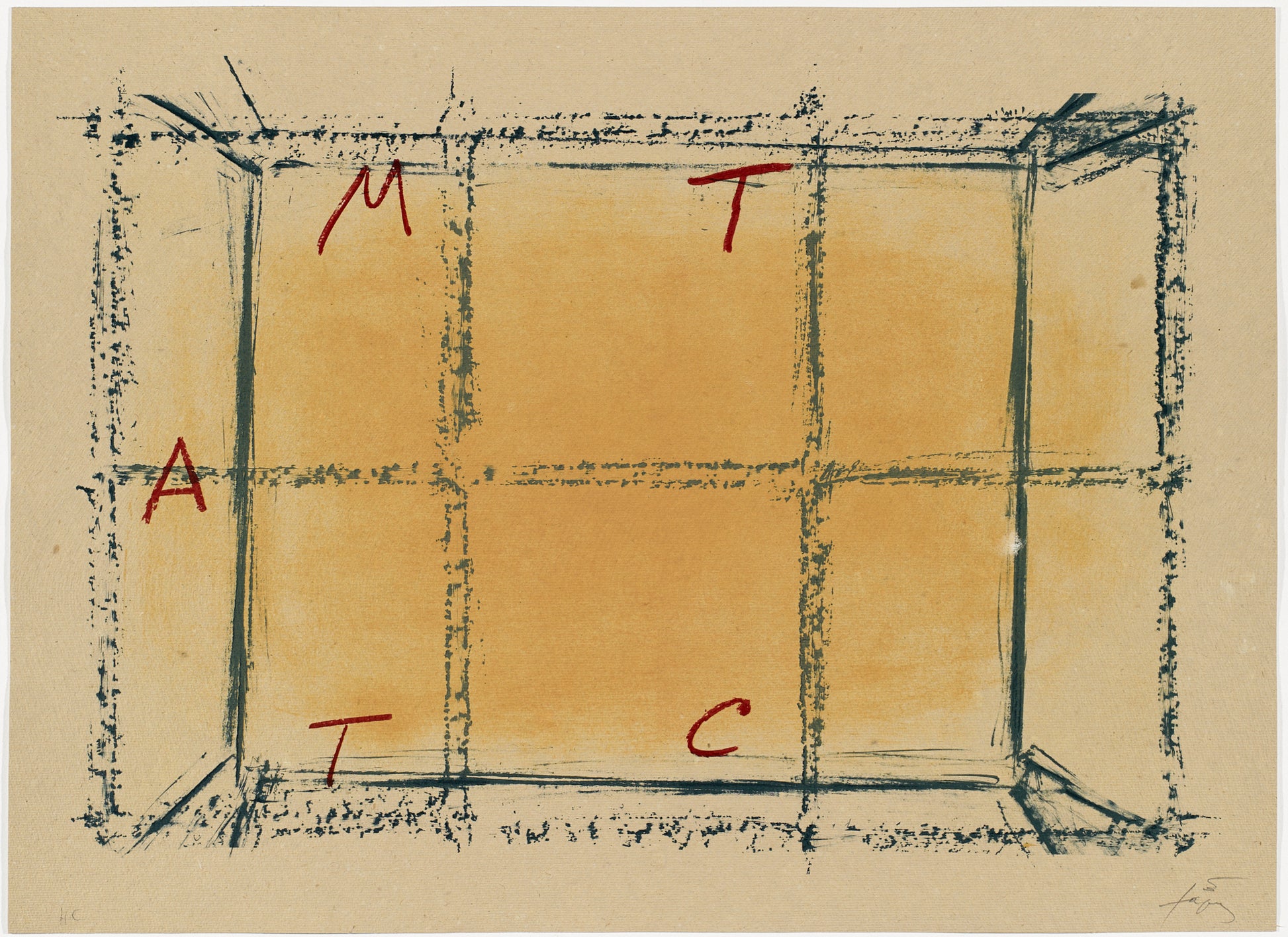This variant of Llambrec 18 is printed "sobre paper d'estrassa", as Debroah Wye notes, this thick brown paper is 'warm-toned, tan-colored Catalan estrassa paper used by butchers to wrap meat, it exhibits a coarse texture with a pronounced weave and many irregularities in the fibers...". Deborah Wye, Antoni Tàpies in print (New York: Museum of Modern Art, 1991), pge 49.