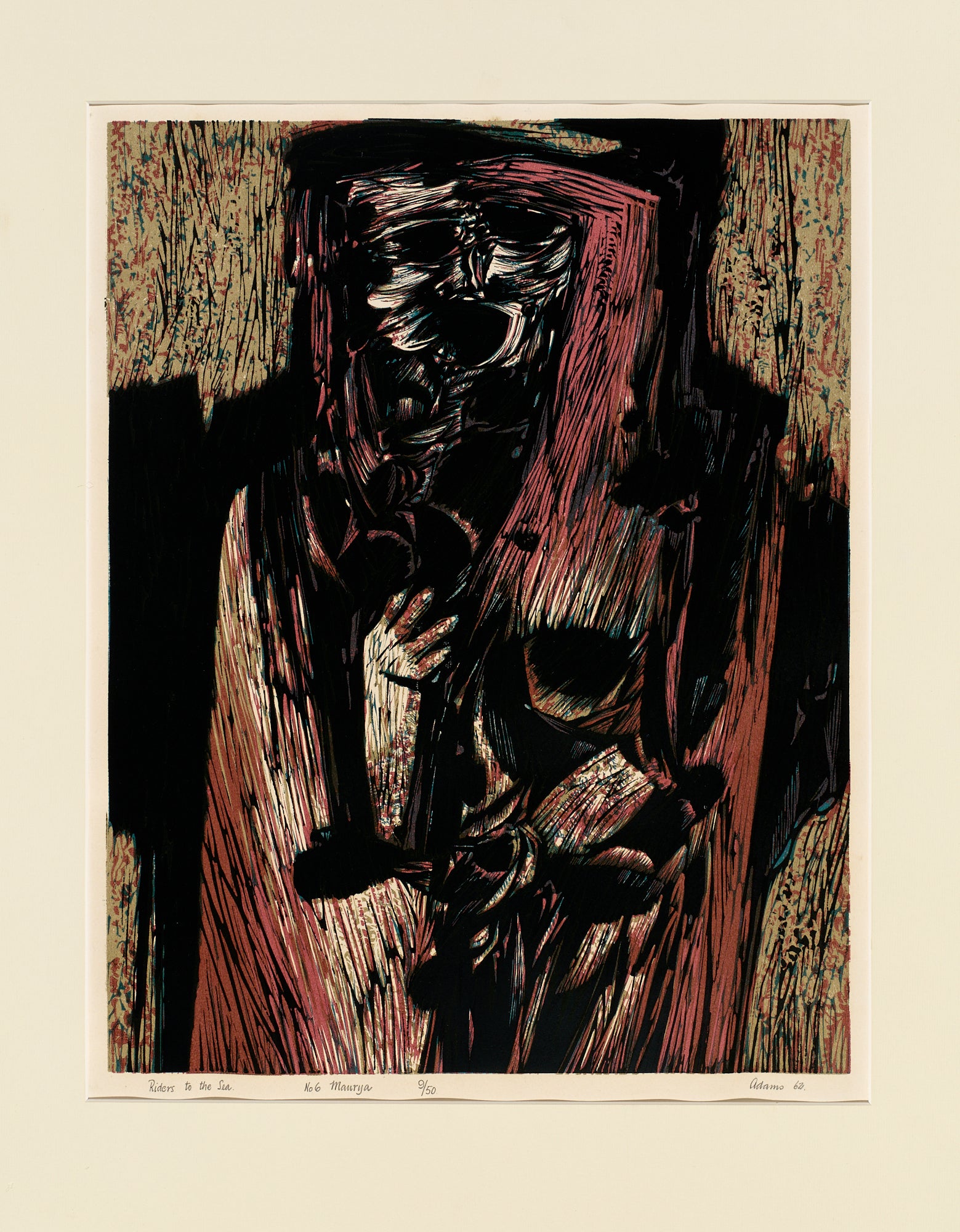 From the Riders in the Sea Series, based on the play by Irish playwright, J.M. Synge. This work depicts the main character of Synge's play, a women of Aran Islands, keening in grief. Maurya is one of Adams' most reproduced images and features his confident, farouche cutting technique.