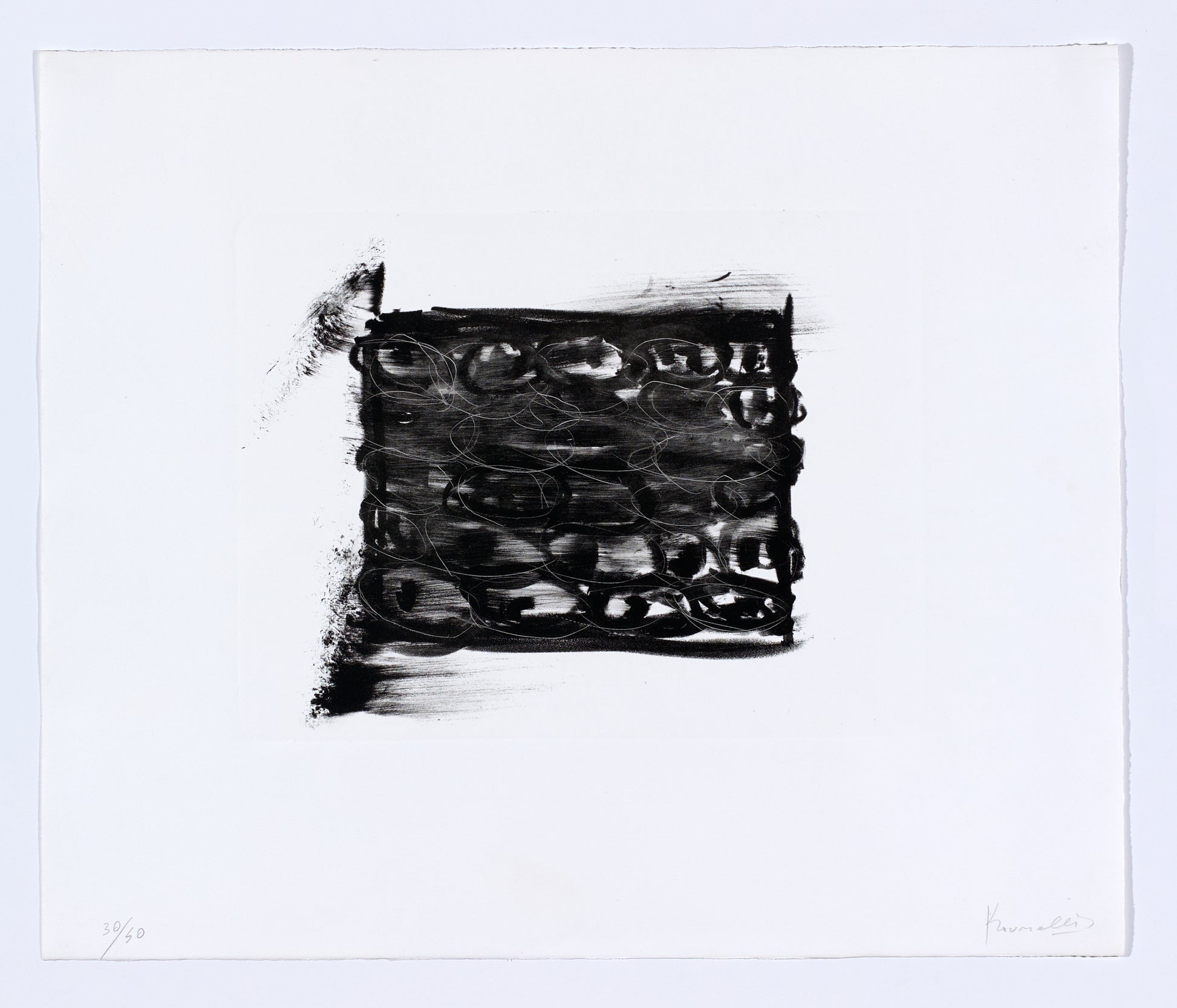 Paired back to recall Kounellis’ base attraction to aggregates, the Mod lithographic series is a succinct presentation of this iconic artist’s intuitions.