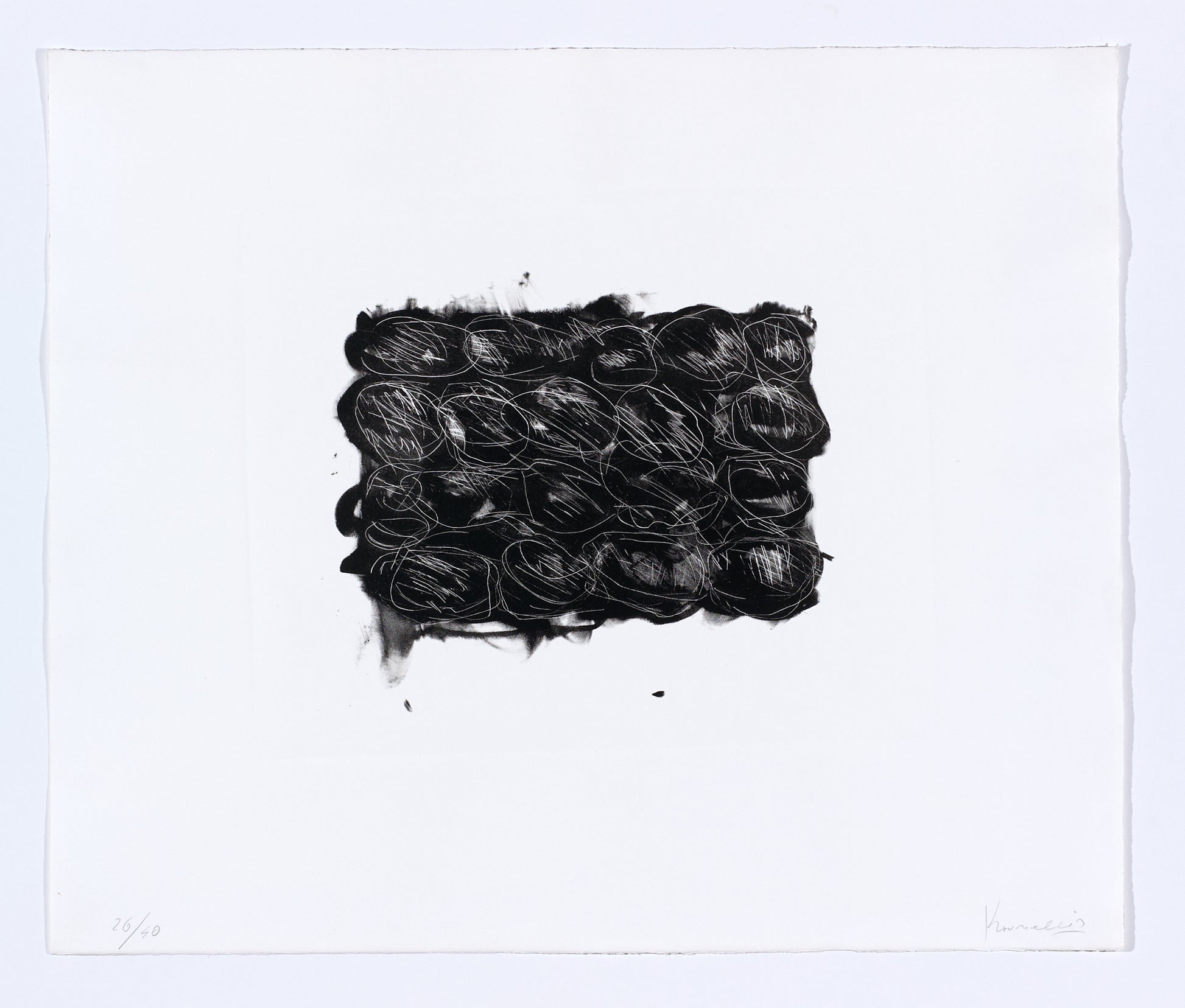 Paired back to recall Kounellis’ base attraction to aggregates, the Mod lithographic series is a succinct presentation of this iconic artist’s intuitions.