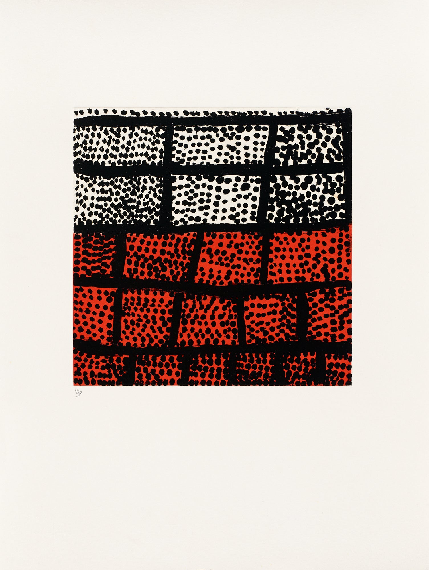 Kathleen Paddoon has depicted some important country for her family, which is south of Balgo in the Great Sandy Desert. This country is named Nakarra Nakarra and is one of the sites of the Seven Sisters Dreaming, a story about seven sisters who travel the ancestral landscape running from an old man who wants to marry the youngest. At Nakarra Nakarra a group of hills embody the seven sisters. The circle depicted represents a tjurrnu (soakwater) and the red blocks of colour show the women dancing.