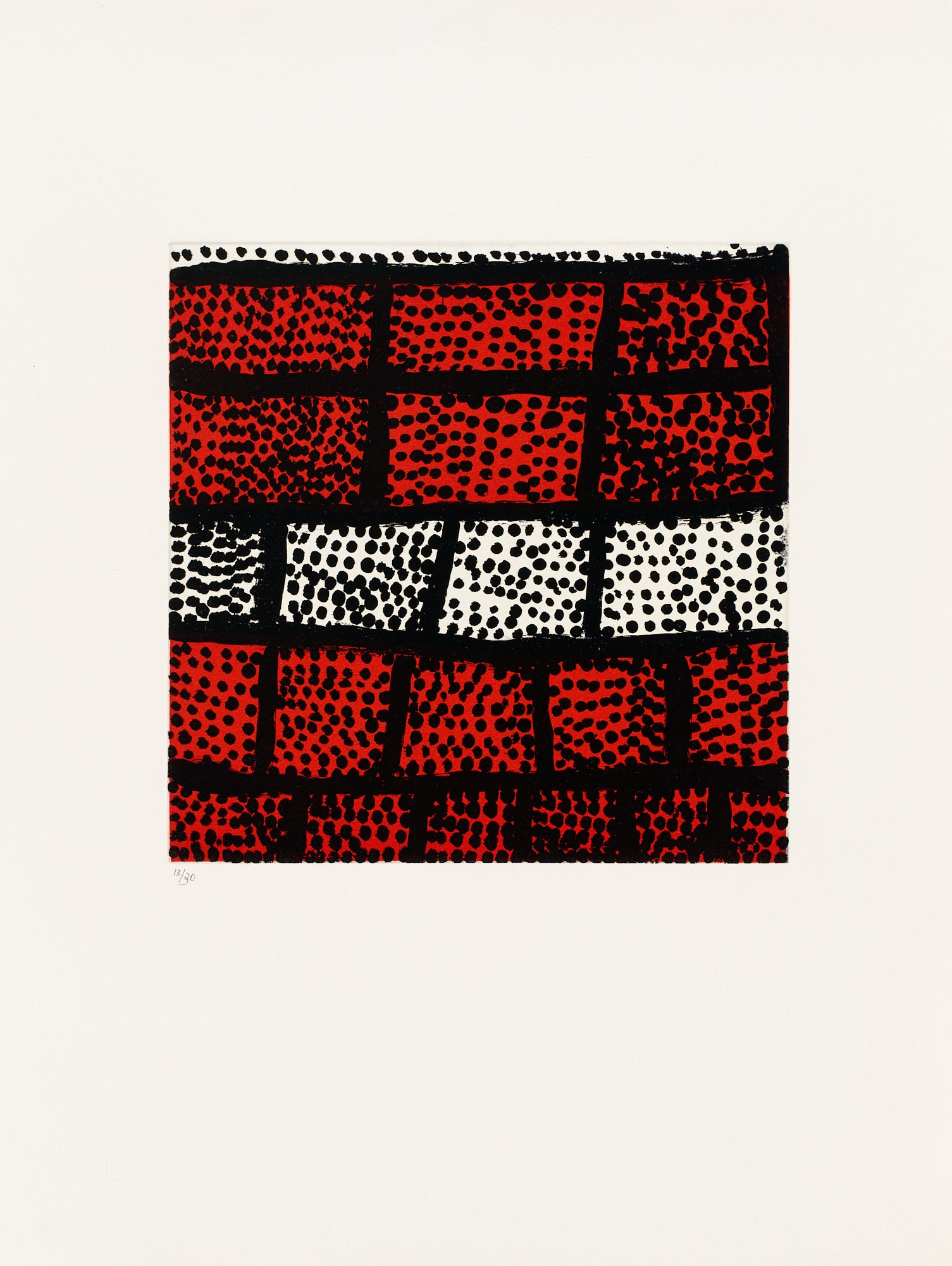 Kathleen Paddoon has depicted some important country for her family, which is south of Balgo in the Great Sandy Desert. This country is named Nakarra Nakarra and is one of the sites of the Seven Sisters Dreaming, a story about seven sisters who travel the ancestral landscape running from an old man who wants to marry the youngest. At Nakarra Nakarra a group of hills embody the seven sisters. The red blocks of colour show the women dancing.