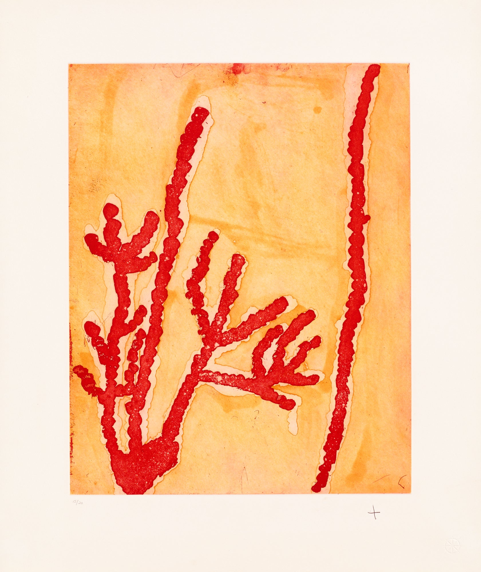 Sugarlift aquatint, printed in red and orange ink, from one plate.