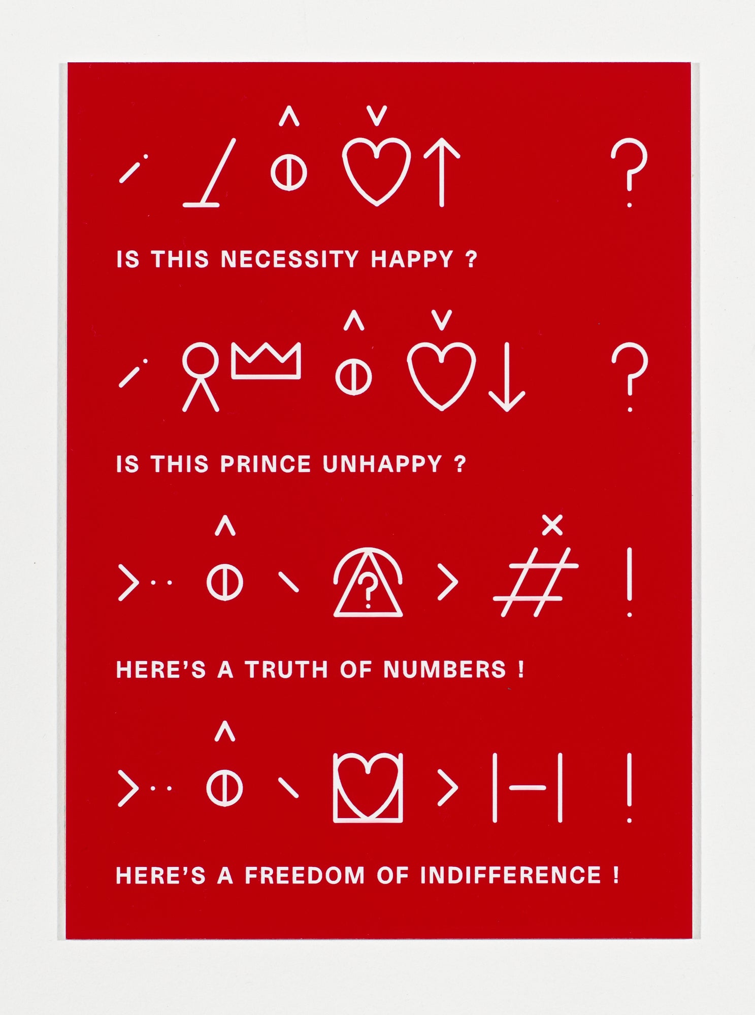Although Bliss was considered by its maker to be a revolutionary invention, one of the apparent, humble uses for Bliss was its trans-lingual application for signage. McNaught honours this by inscribing his translations on engraved traffolyte (a plastic material commonly used for signage). His words, however, a cribbed from various sources, are not straightforward directives. McNaught advises that, to become fluent in Bliss, “you can only fall in love with it, the way you fall in love with a person: nonfluently, partially, with some degree of creative misunderstanding.”