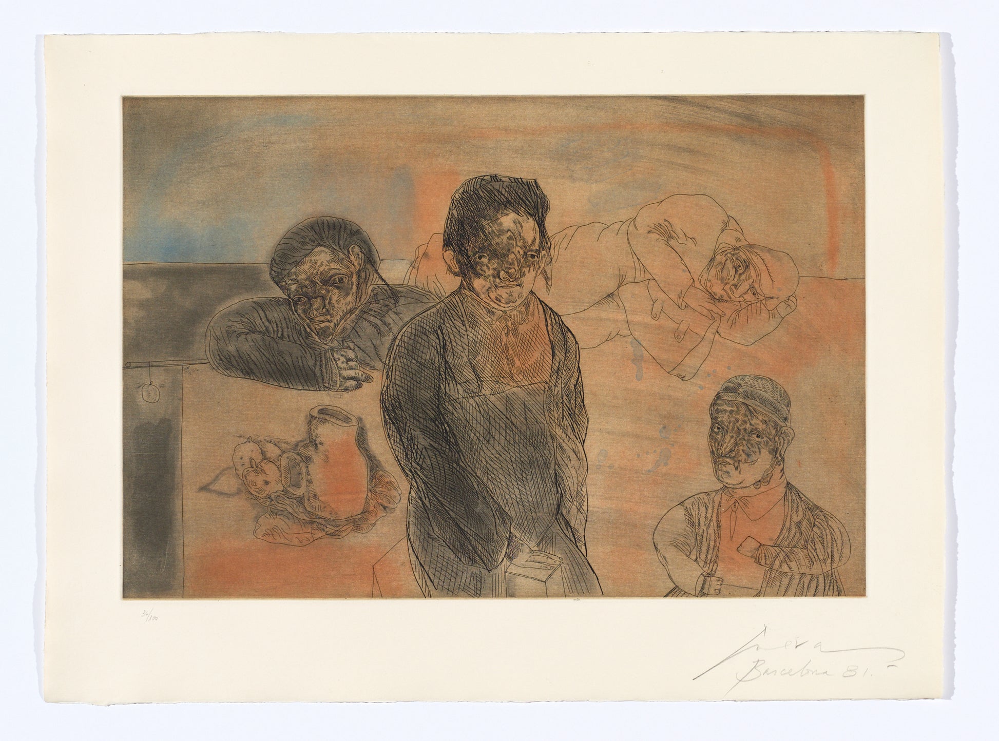Etching, spit-bite aquatint with à la poupée, printed in black, brown, grey, blue and orange ink, from multiple plates.