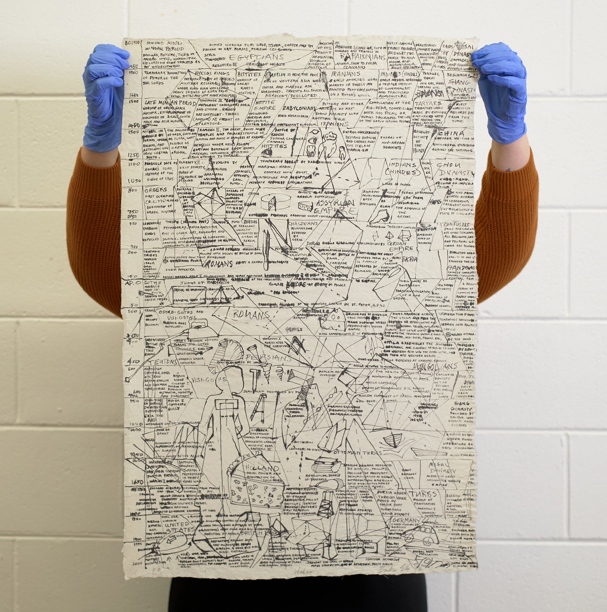 This work features a timeline of human culture interlaced with images of wedge-forms. Almost conspiratorially, we are invited to imagine the whole of human history as a reflection of the evolution of wedge-based technology.
